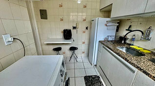 - área de serviço com máquina de lavar e armário;